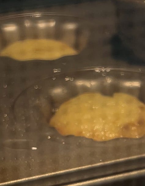 Quickly fill forms about 3/4 or 4/5 of the way. (They will rise a bit, so you don’t want to fill them all the way up.) It will sizzle a bit but shouldn’t splatter.