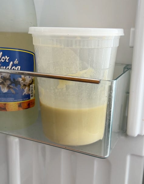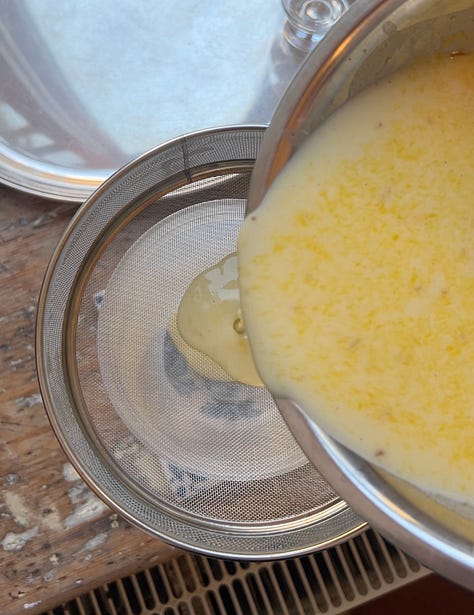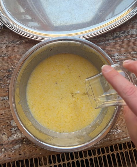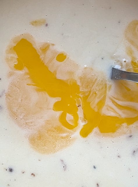 Retrieve canelés liquid from fridge and stir. (It will have separated.) Take out pod and tea bag, if used.