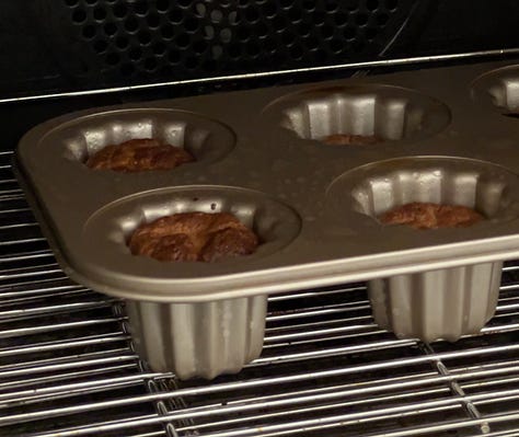 Take out and let cool, before using a knife to carefully wiggle between canéles and form in several places. They will stick quite a bit but, since they are basically a custard, they are pretty forgiving and spring right back. (Hehe.)