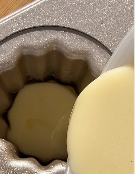 When ready to finally bake, preheat oven to 230°C fan. Place canelés moulds in oven to preheat as well.