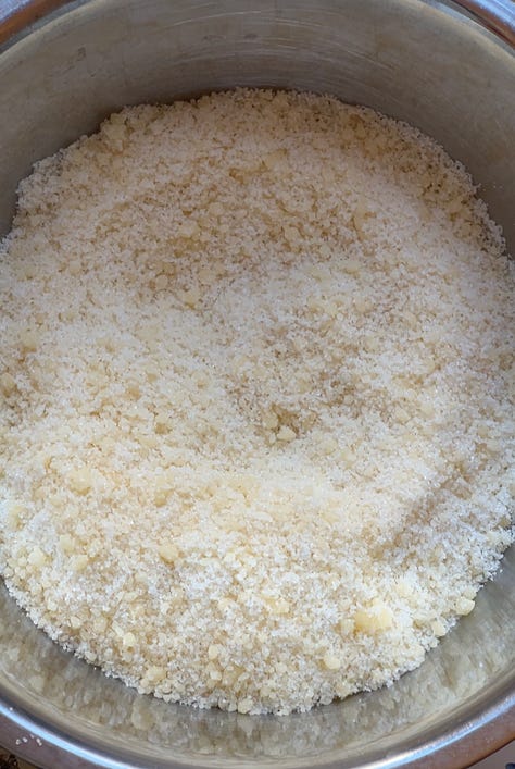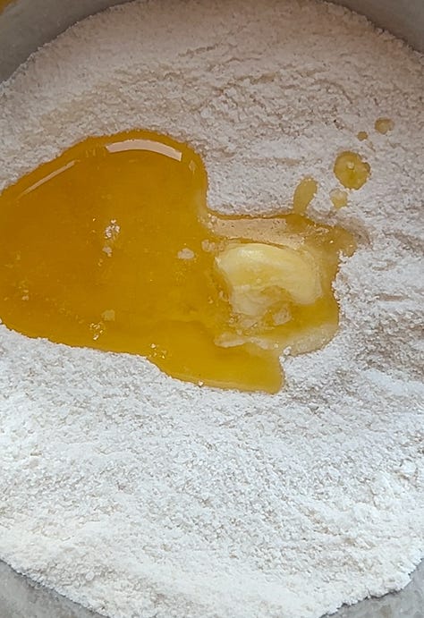 Add melted butter and whisk (with fork or whisk or even hands) until you get a grainy sandy texture (see pic).